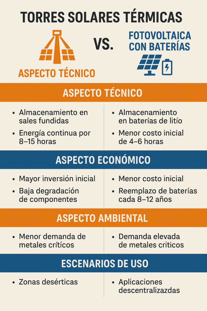 Las torres solares térmicas ofrecen una solución robusta para energía nocturna de larga duración, mientras que la fotovoltaica con baterías es más flexible y modular. Juntas forman un dúo imbatible en la transición hacia un sistema eléctrico 100% renovable, eficiente y sostenible.